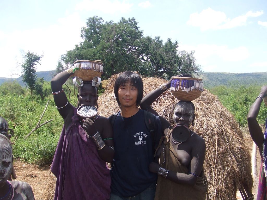 エチオピアの少数民族ムルシ族と。唇を切開し皿を挿入する文化は、その昔近隣部族から村の女性が拉致されるのを防ぐために始まった。