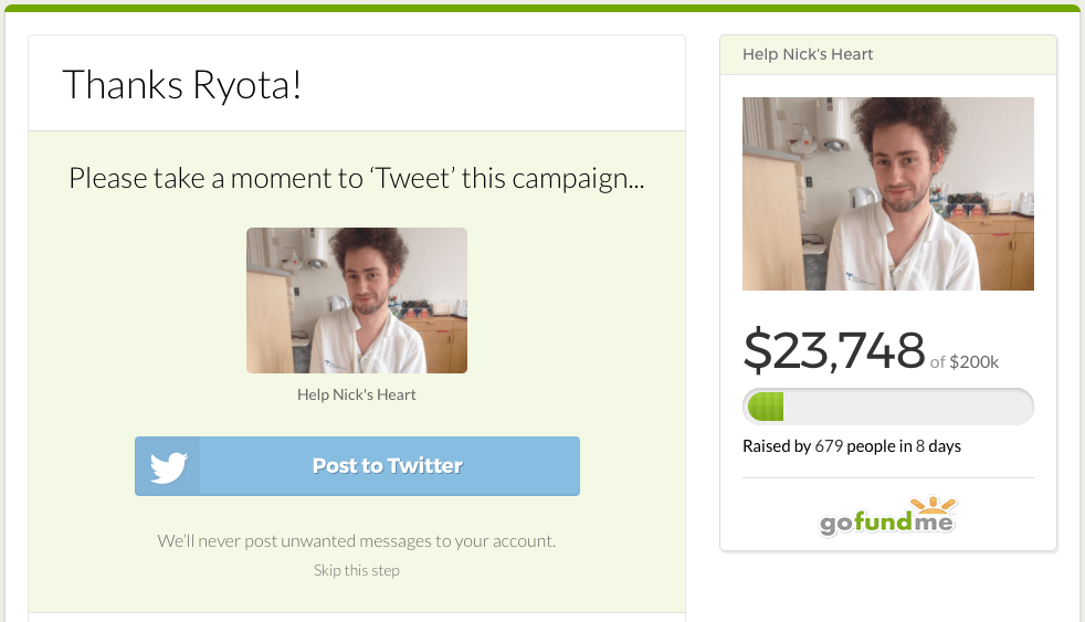 大変微力ですが、僕も記事を公開した直後に23ドル寄付させてもらいました。23は僕の誕生日かつ妻の一番好きな数字であり、僕たち夫婦のラッキーナンバー。ラッキーよ届け!という思いで、23ドルにしました。その後Facebook・Twitterでシェアするページが現れますから、そちらでもぜひシェアを。