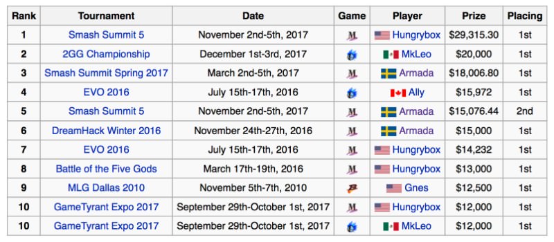 スマブラDXの場合、これまでの賞金の最高額は2017年11月の『Smash Summit 5』で優勝した世界王者HungryBoxの獲得した$29,315(約320万円)です。