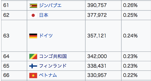 上の画像の通り面積は244の国と地域中65位と上位30%以内に入っていて、実はヨーロッパで7番目に大きい国。