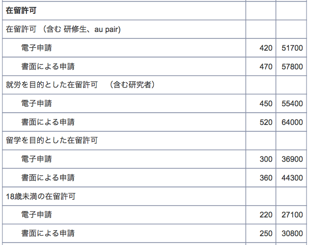 留学や転勤を含む移住の場合は在留許可が必要になり、申請する在留許可の種類に応じて費用がかかるんですが、なんとその申請費用は5万円以上!留学の場合少し安くて36,900円で済みますが、在留許可の申請ひとつでこれだけの費用がかかるのは驚きです。