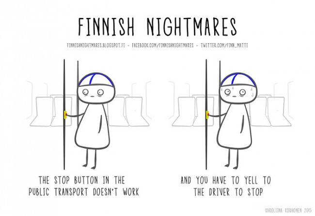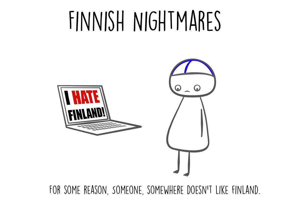 「フィンランド人の悪夢」と題された、フィンランド人の性格が題材のイラストジョークシリーズ。結構人気!英語で書かれています。