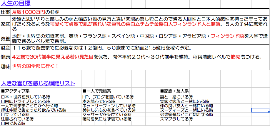 人生の目標家庭編は、「愛嬌と思いやりと慈しみの心と幅広い物の見方と違いを認め楽しむことのできる人間性と日本人的感性を持った守ってあげたくなるような可愛くて貞淑で肌がきれいな巨乳の色白ムチムチ金髪白人フィンランド人と結婚、5人の子供に恵まれる」としました。