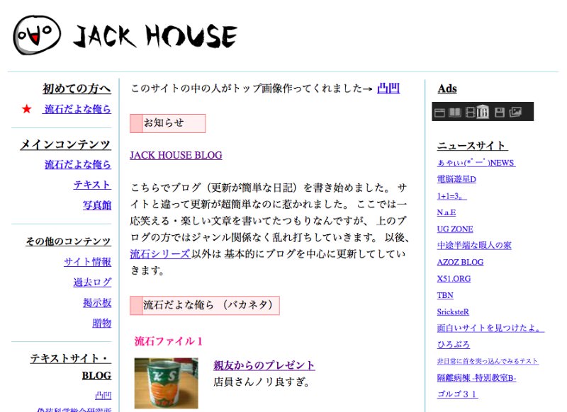 当時作ったそのサイトのタイトルが、『JACK HOUSE』。上の画像のサイトです。このブログのタイトルもJACK HOUSEですが、これは15年前に運営していた旧JACK HOUSEを復活させたものです。