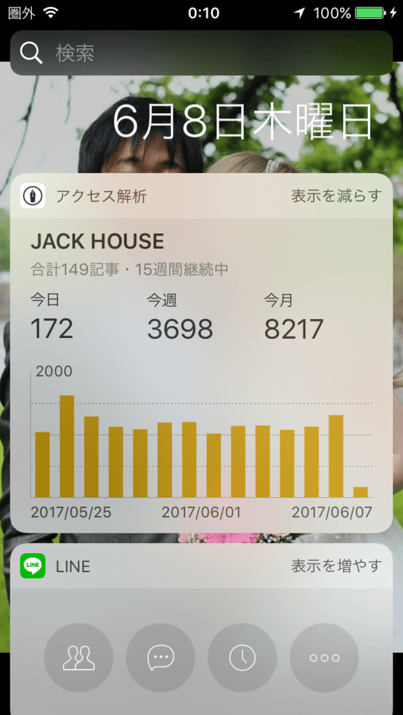 なぜかと言うと、少し前のiOSのアップデートで、ホーム画面もしくは待ち受け画面で左にスワイプすると各アプリへのショートカットが表示されるようになり、わざわざアプリを起動しなくてもアクセス数を確認できるようになったから。劇的に便利になりました。
