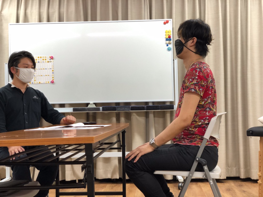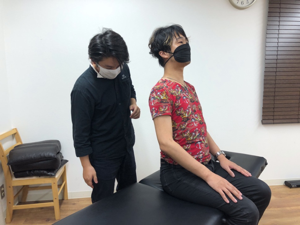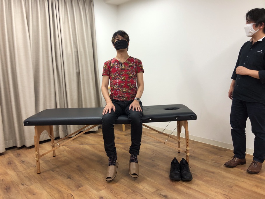 また、姿勢についても改めてチェックしたいので、マッサージベッドに座っていただき、先ほどのように良い姿勢を作ってみましょうか。