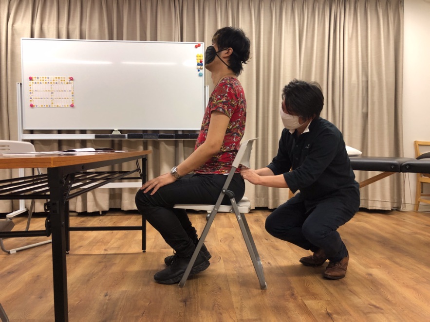 さて、そうしたら枕を外して、上半身を起こしてもらっていいですか。そして、先ほどと同様に、若干の反り気味の良い姿勢で座ってみてください。